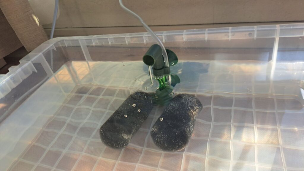 屋外の水温が約15℃、だったため室内容器のヒーター設定を15℃に設定し水温合わせと水合わせを行い、環境の変化による負担を抑えるようにしました。