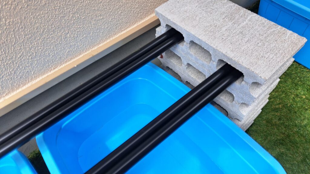 このブロックを両側に5つずつ積み重ね、その穴にイレクターパイプを2本ずつ差し込んでいきました。こうすることで、パイプがしっかりと固定され、安定した土台になります。